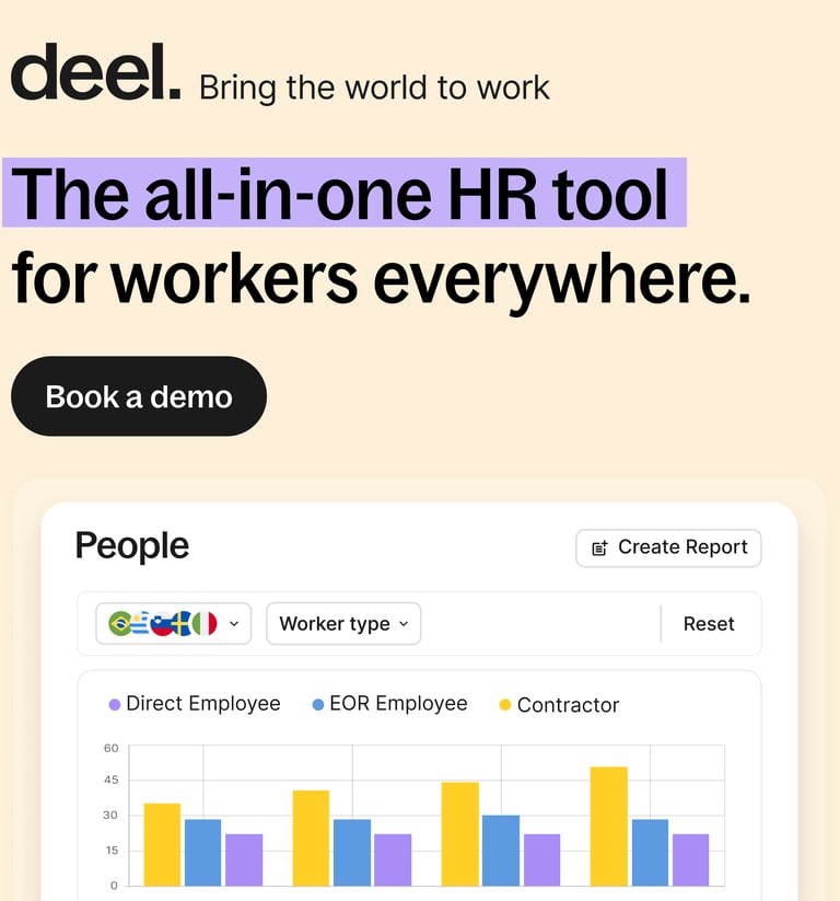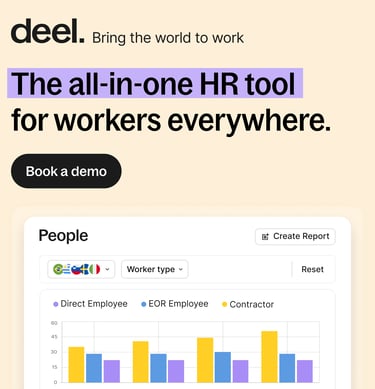 Deel is an all-in-one global HR platform that enables businesses to hire employees and contractors in 150+ countries. It handles everything—contracts, payroll, taxes, and compliance—so you can focus on what matters most: growth.